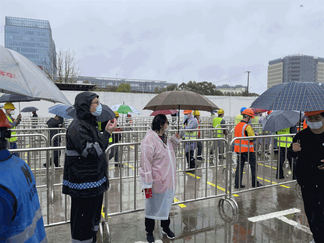 针对建筑工地等园区重点区域的复杂形势,园区始终保持高度的警惕性。3月17日-18日,为配合属地政府部门防疫要求,赵巷公司分管领导身先士卒、靠前指挥,与应急管理队伍一起,冒雨组织一、二、三期项目五个标段近1600名施工人员进行新一轮核酸检测。以使命和担当,为工人送去关怀和温暖,为项目建设提供坚实保障。