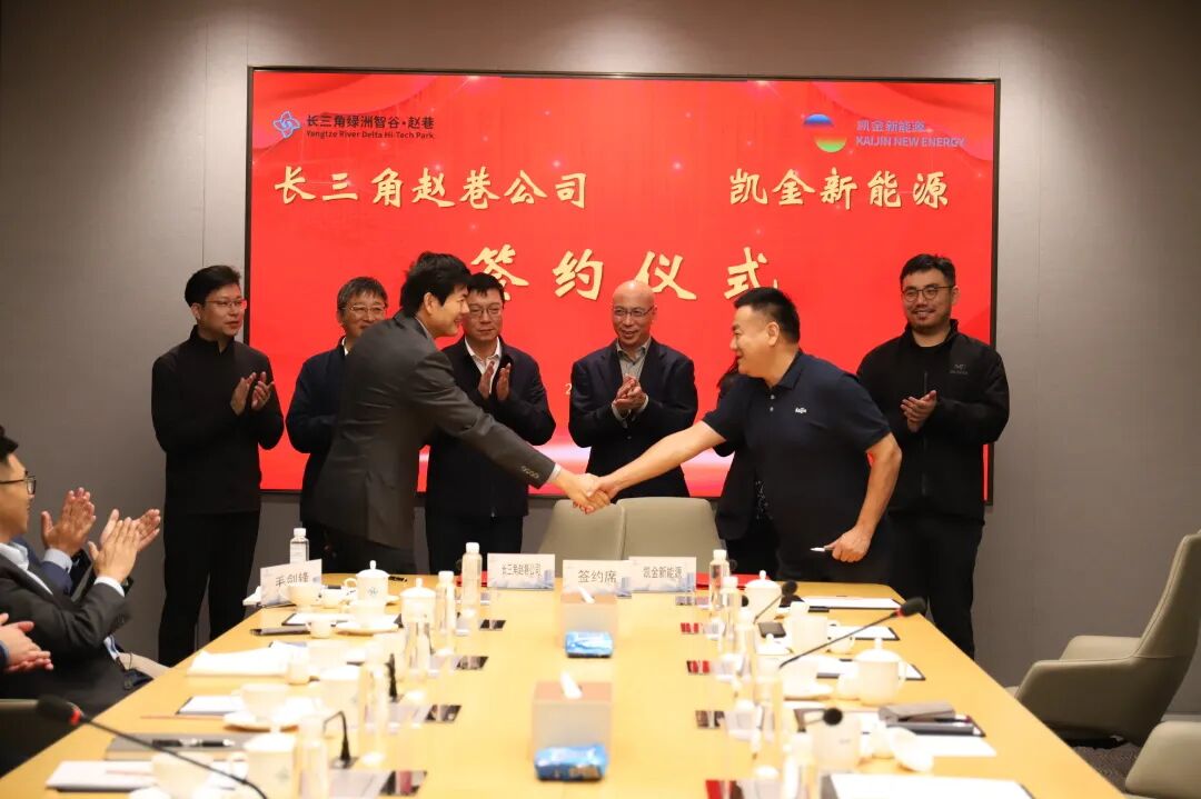 长三角赵巷新兴产业经济发展(上海)有限公司总经理王诚、凯金新能源集团总裁办副主任费建国就凯金新能源集团上海科创中心落户长三角绿洲智谷·赵巷签订协议,凯金新能源集团上海科创中心建筑面积约6300平方米,位于长三角绿洲智谷·赵巷D区独栋总部区域。