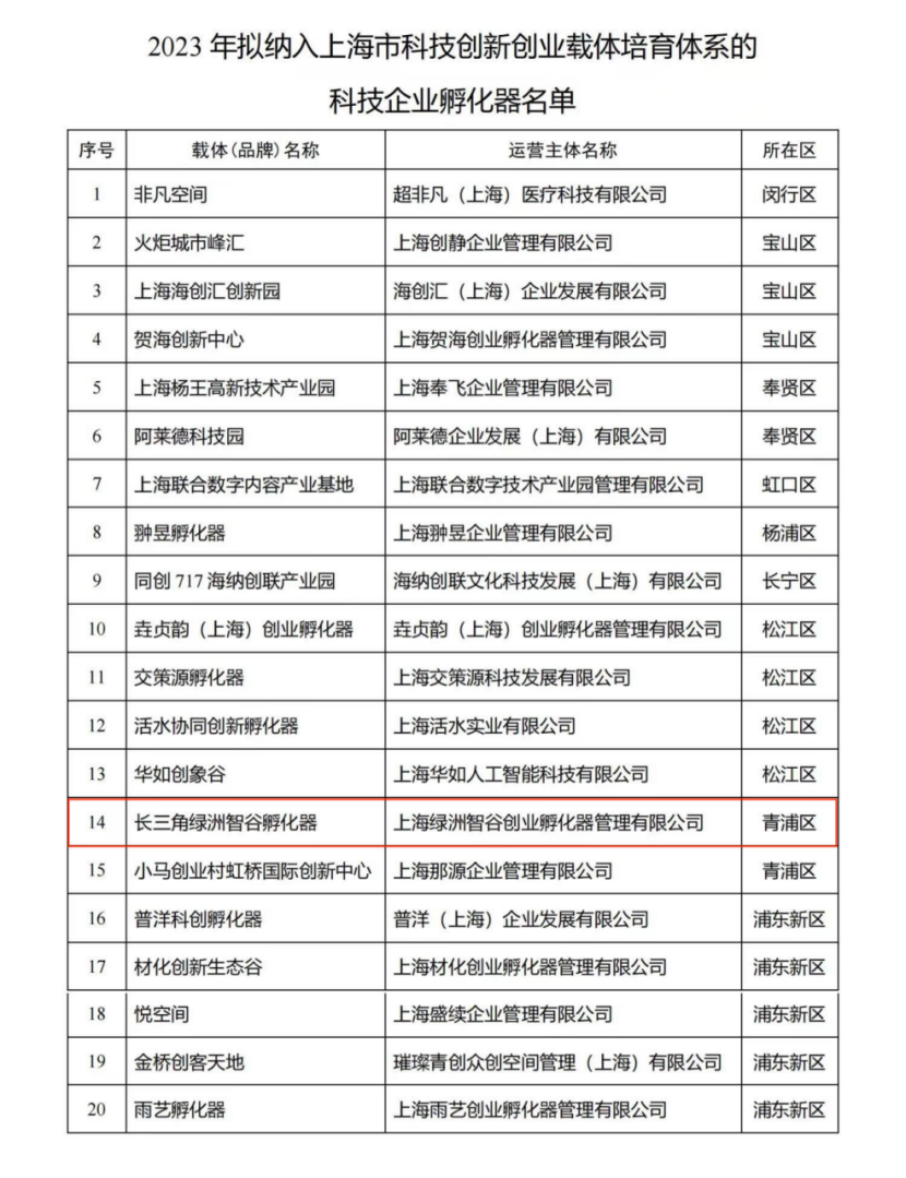 近日,根据《上海市科技创新创业载体管理办法》(沪科规〔2023〕12号)的相关精神和要求,上海市科委公示了2023年纳入科技创新创业载体培育体系载体名单,经自主申报、形式审查和专家评审等评选流程,长三角绿洲智谷孵化器榜上有名。
