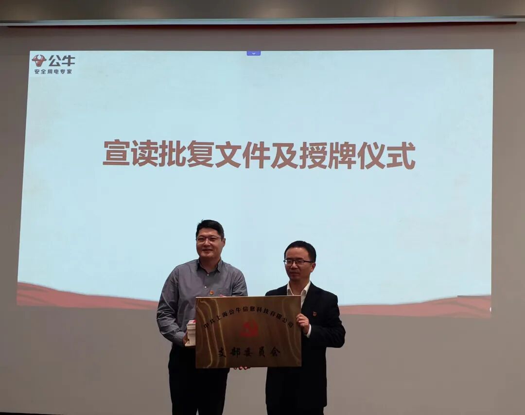 赵巷镇党委组织委员、社会党委副书记朱键宣读上海公牛信息科技有限公司党支部成立的通知并为其授牌赠书。