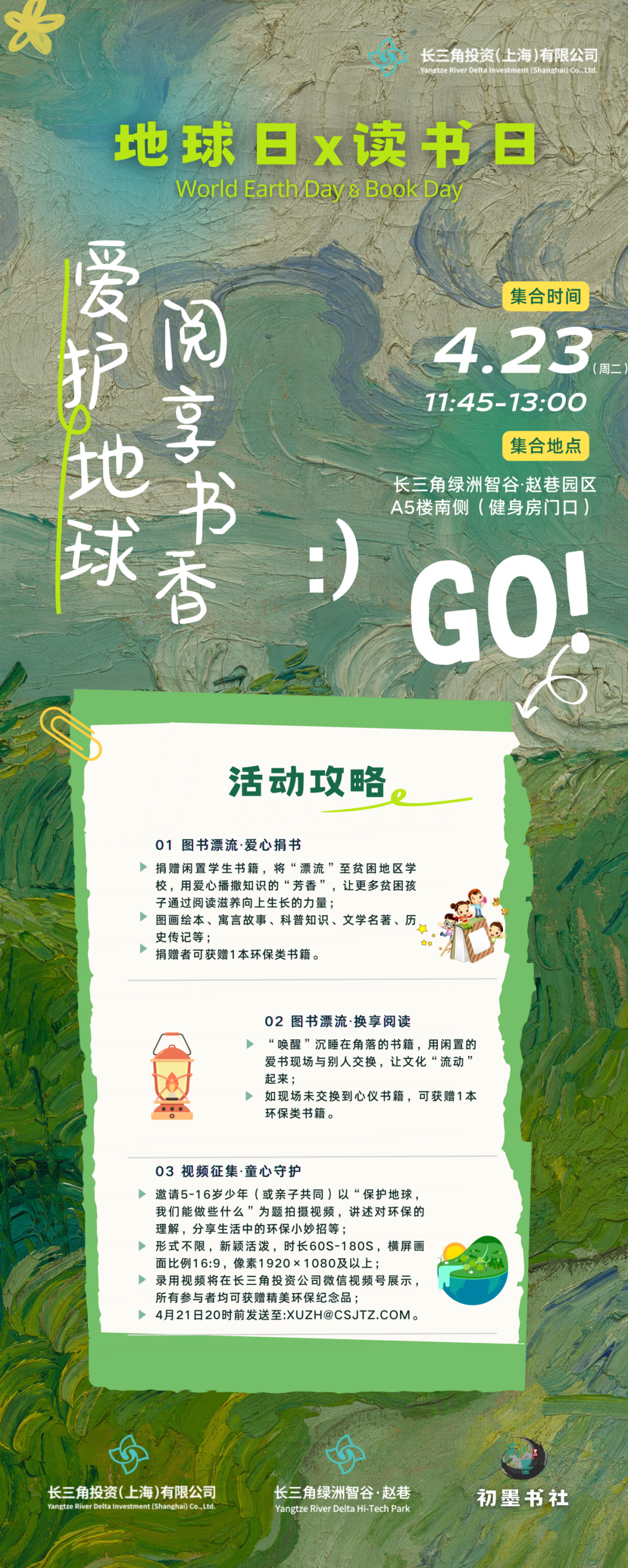 在世界地球日&读书日到来之际,为进一步倡导低碳环保、坚持阅读的理念,解锁更多爱地球、爱阅读的方式,由长三角投资公司发起,携手长三角绿洲智谷·赵巷园区、初墨书社联合开展“爱护地球·阅享书香”系列活动。