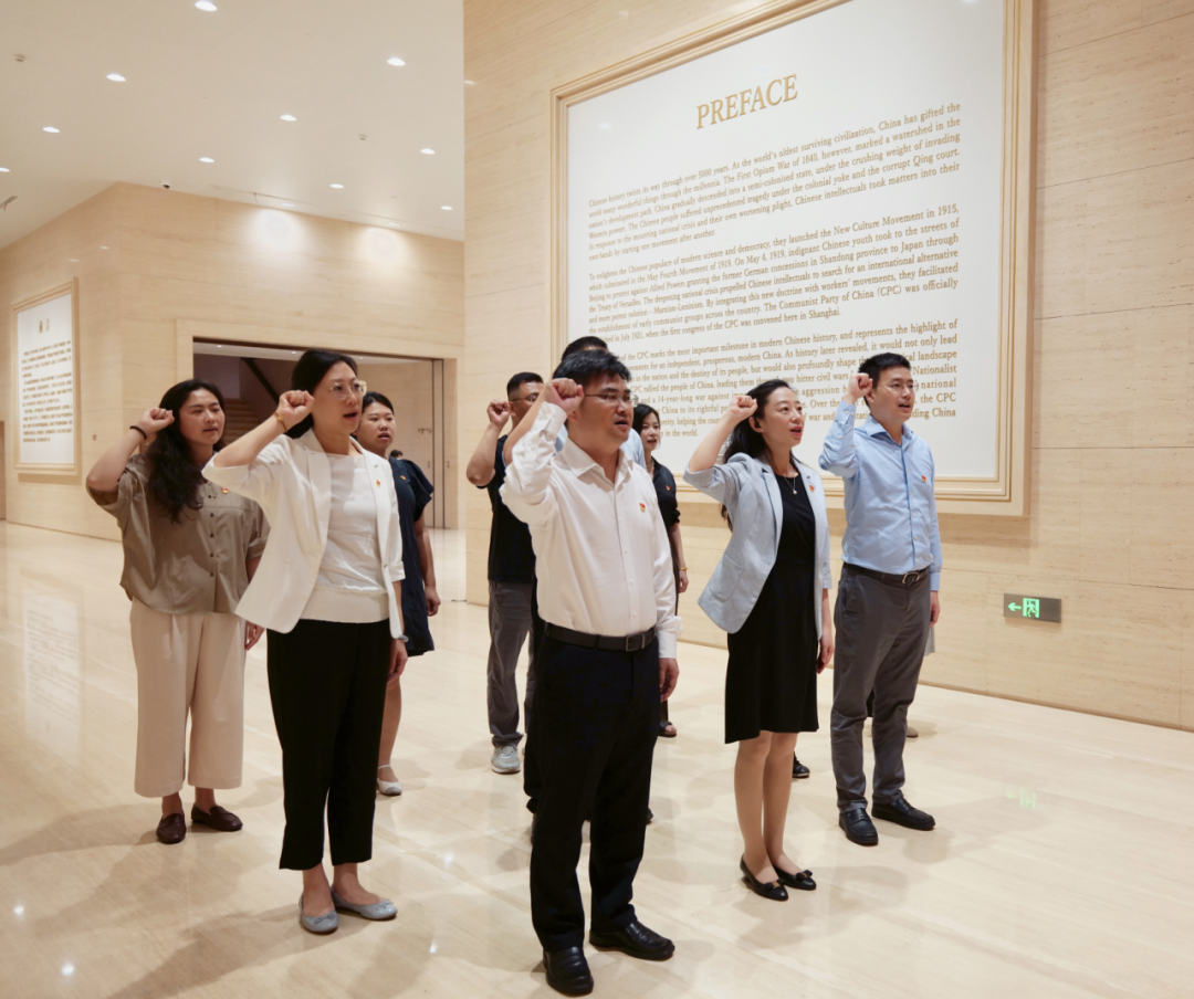 在中共一大纪念馆宣誓大厅,公司党总支书记、总经理蔡喆玉庄严领誓,带领党员们面对鲜红的党旗重温入党誓词,再一次坚定为党的事业奋斗终生的理想信念。长三角一体化发展是习总书记亲自谋划、亲自部署、亲自推动的重大战略,是新时代党的伟大事业,能够投身长三角绿洲智谷·赵巷园区建设发展,我们何其有幸,更是需要一代代长三角人戮力同心、接续奋斗。铮铮誓言在每一位党员的心中回响,表达了党员们心怀“国之大者”、勇担使命的坚定决心。